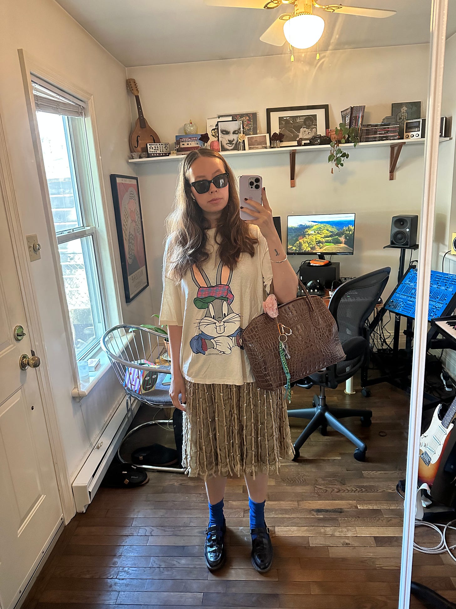 It came to me when I was styling a new (to me) skirt I found at Seconde Vintage in Montreal. I’d had it on with a pair of loafers and was feeling like it could very easily fall into formal old lady territory. A quick paw through Marcus’s wardrobe led me towards his oversized Bugs Bunny shirt, and styled together, a persona manifested. I texted a photo to my friend Lucie, who I’d bought it with, almost immediately. “I feel like an Italian grandmother who slept over at her grandsons’s and nabbed his tee the next morning.” I wrote to her.